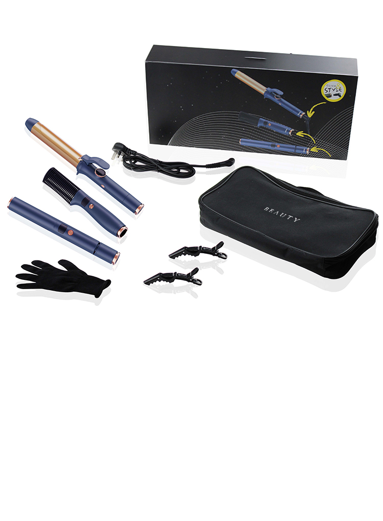 Detta 3 i 1 hårstylingset innehåller en 25 mm plattång, en 32 mm locktång och en plattångborste. Med den löstagbara nätsladden kan en enda nätsladd styra tre enheter, vilket sparar mycket utrymme. Med denna uppsättning stylingverktyg kan du uppnå olika hårdesigner.