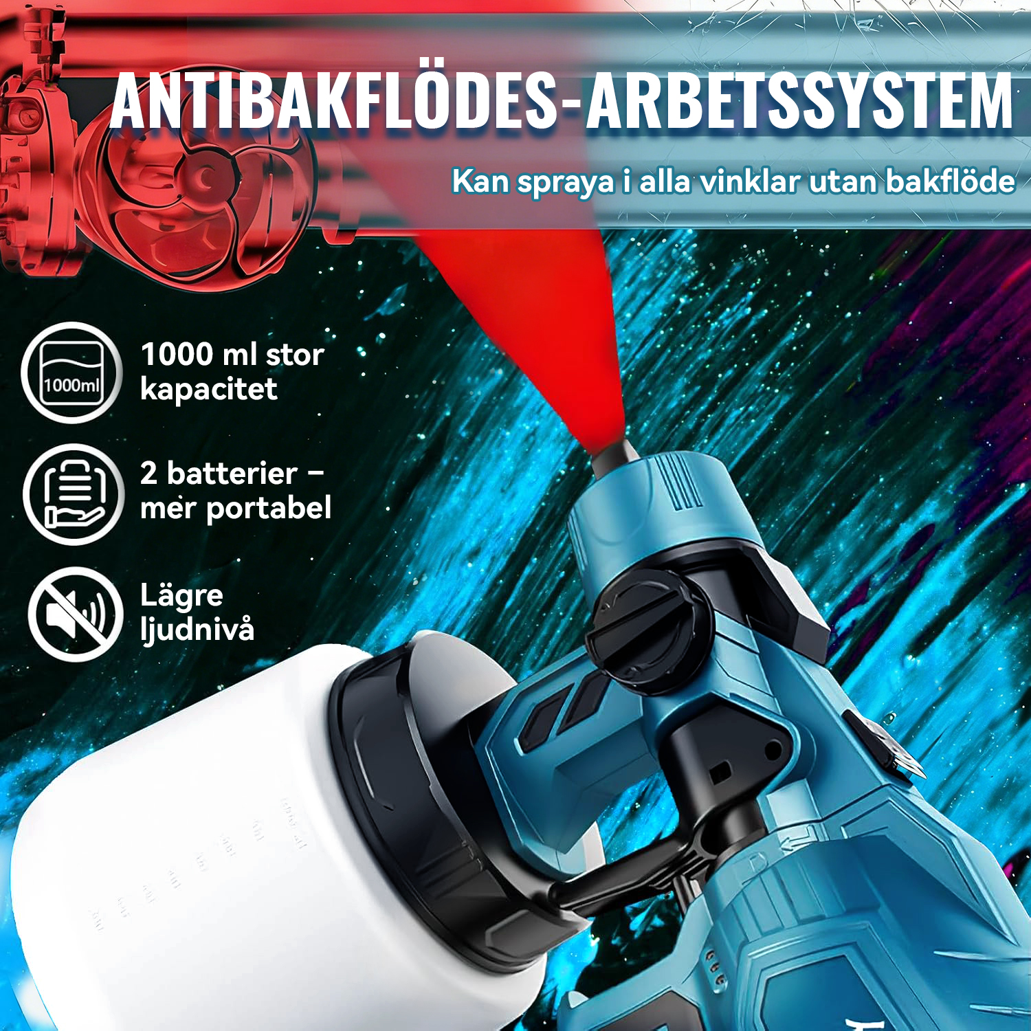 Njut av friheten att måla var som helst med denna sladdlösa färgspruta – inga sladdar, inga begränsningar. Airless-tekniken ger en jämn och slät täckning som gör målningen mycket enkel. Utformad för arbete i farten och är ditt självklara sladdlösa färgspruteverktyg för DIY, både inomhus och utomhus.