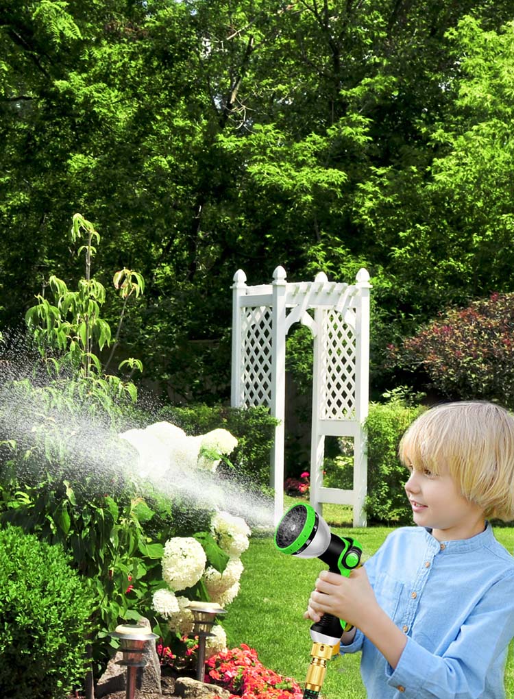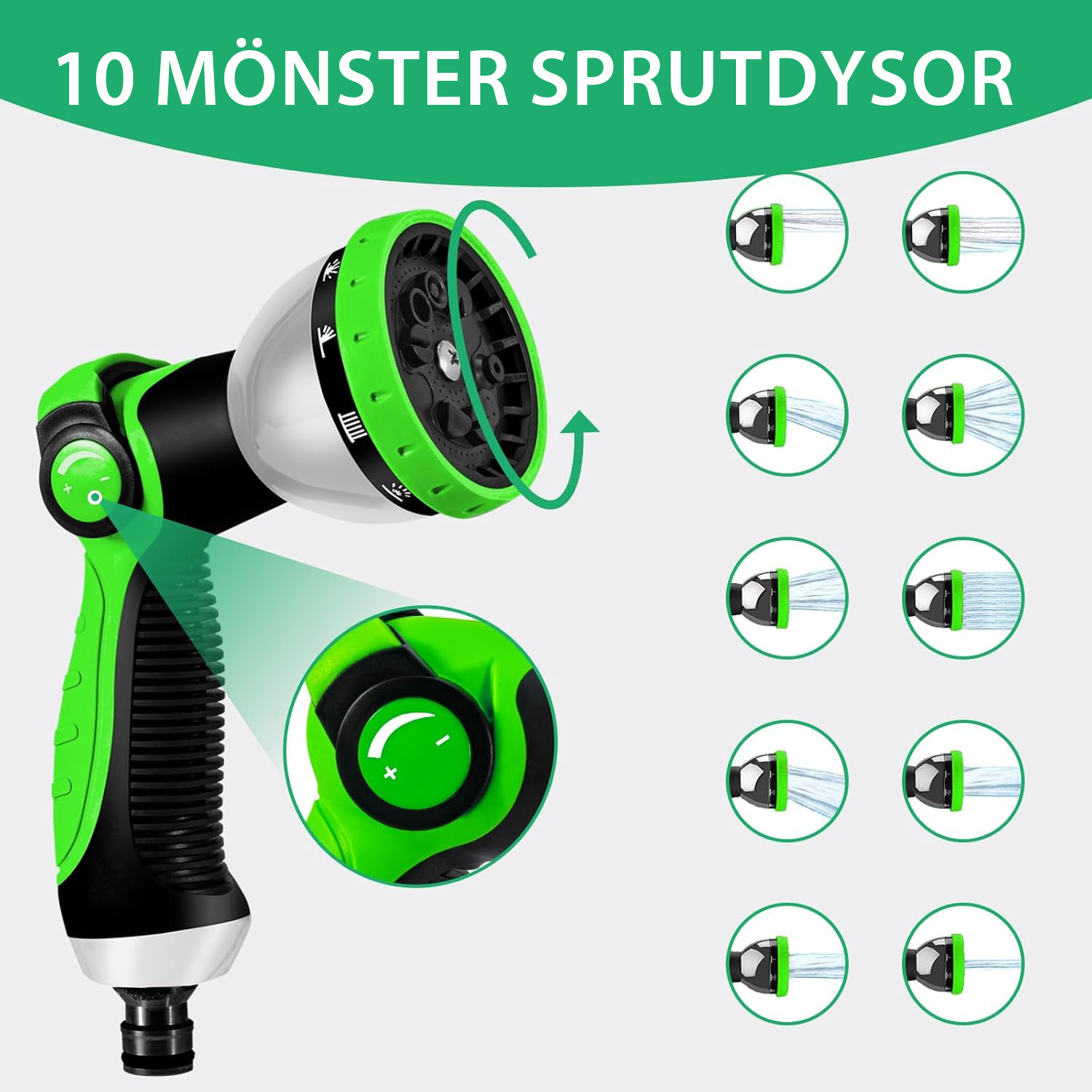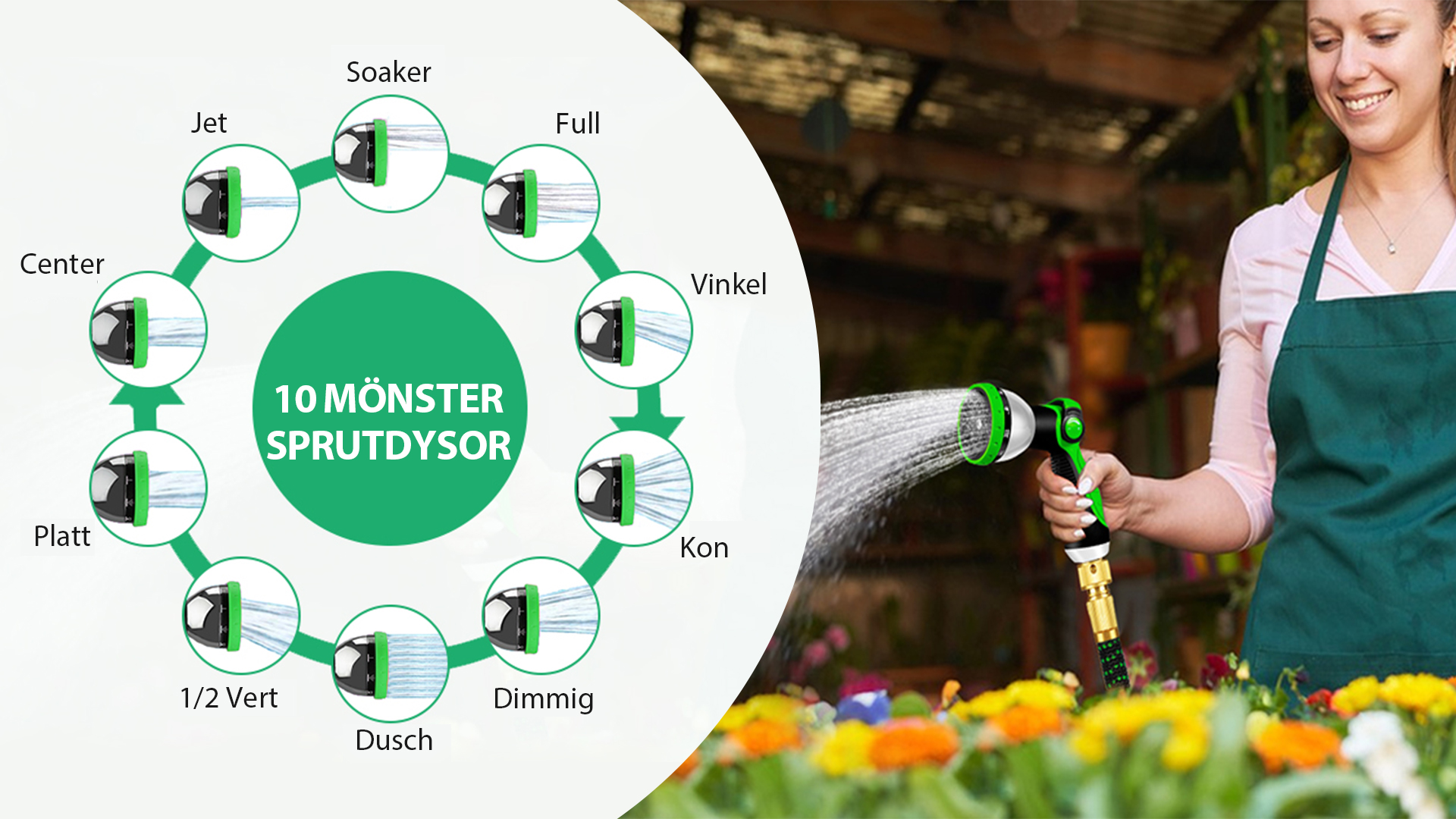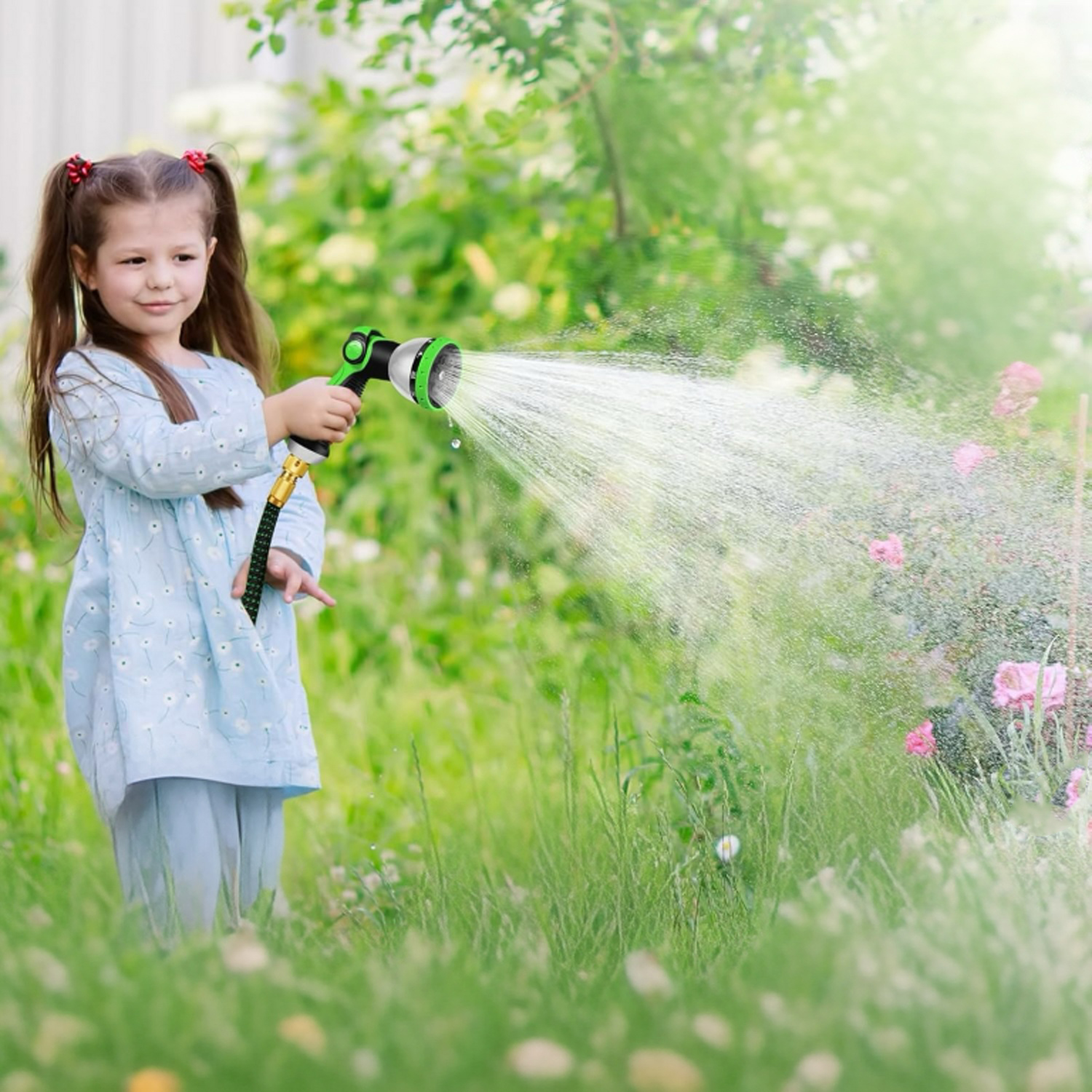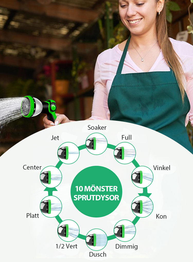 Vår 30 m hopfällbara vattenslang levereras med ett uppgraderat 10-mönster munstycke, vilket ger fler alternativ än typiska modeller. Rotera enkelt för att välja önskat sprayläge, vilket gör den idealisk för trädgårdsarbete, rengöring, tvättning av husdjur eller bilunderhåll.