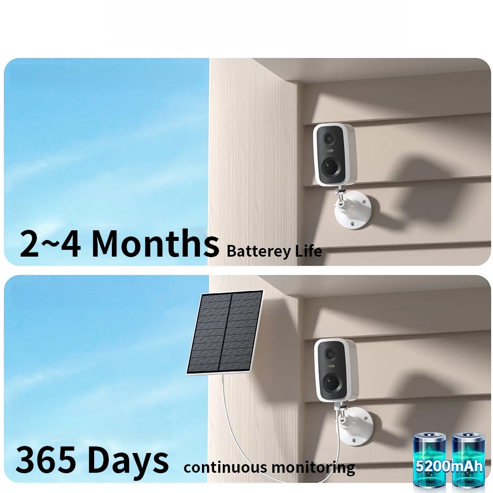 Säkerhetskameran kommer med ett inbyggt 5200 mAh batteri och stöder laddning med solpanel, vilket gör att den kan fungera dag och natt utan avbrott. Dess 100 % trådlösa design säkerställer enkel och flexibel installation för utomhusövervakning. Du kan också övervaka batterinivån i realtid via den medföljande appen, så du alltid vet när den behöver laddas.