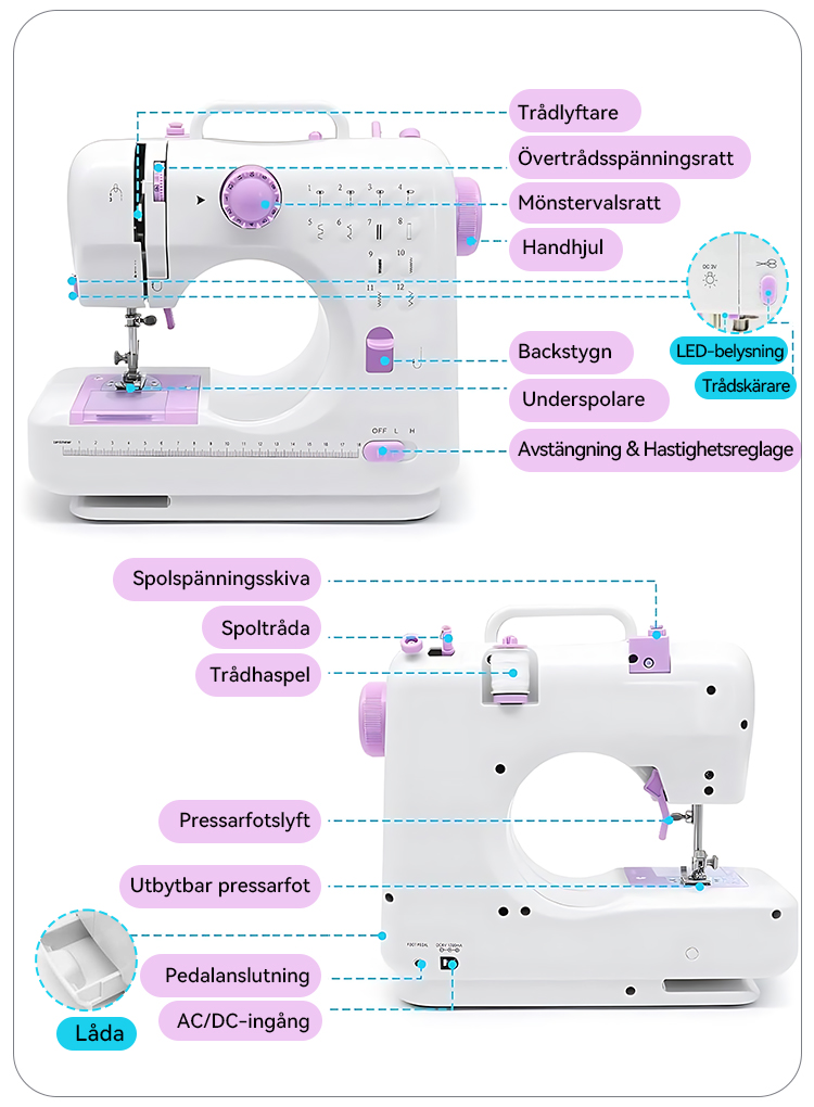 Grundläggande funktioner: Utför enkelt överkastning, knapphåls- och grundläggande sömnad.