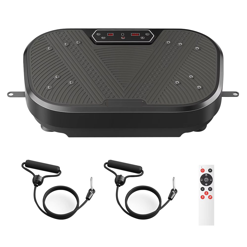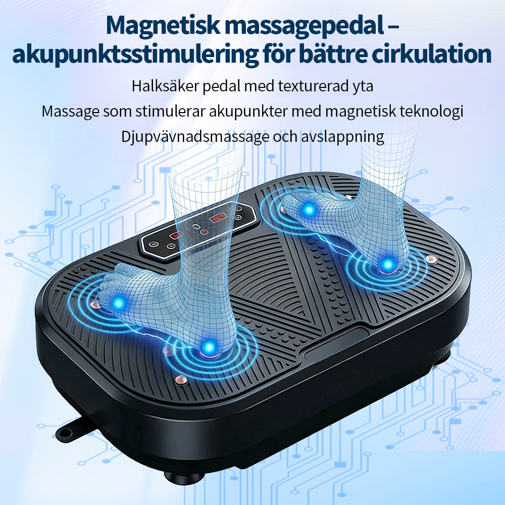 Vår vibrationsplatta är utrustad med en innovativ magnetisk massagepedal. Ytans texturerade mönster efterliknar akupressur och stimulerar, tillsammans med inbyggda magneter, fotsulornas punkter under vibrationen. Detta ökar inte bara träningskomforten utan främjar även blodcirkulationen, vilket ger en djupgående vävnadsmassage och minskar muskeltrötthet med varje vibration.
