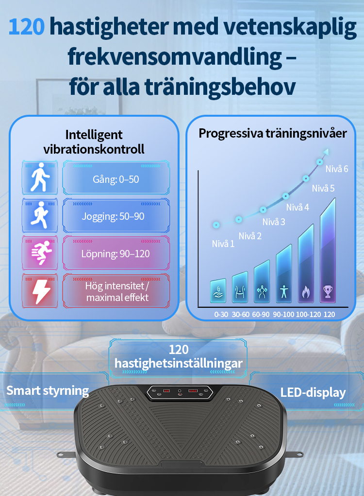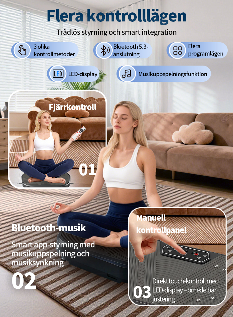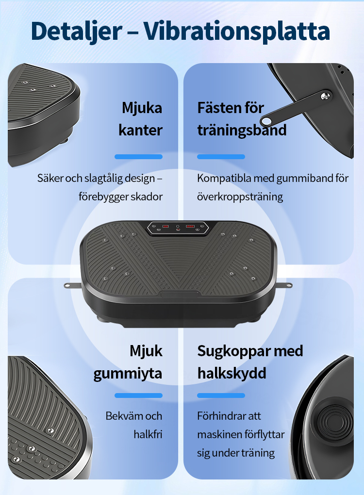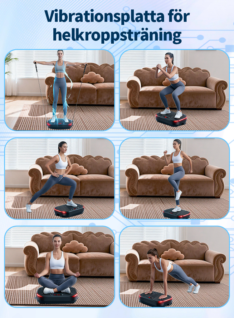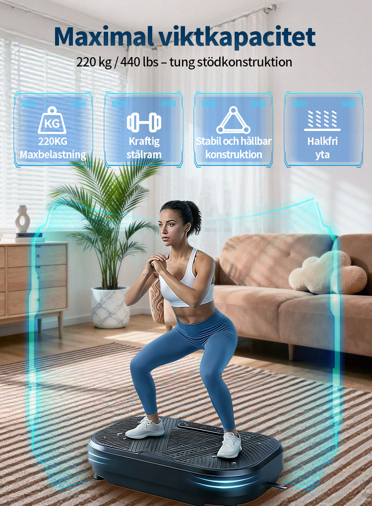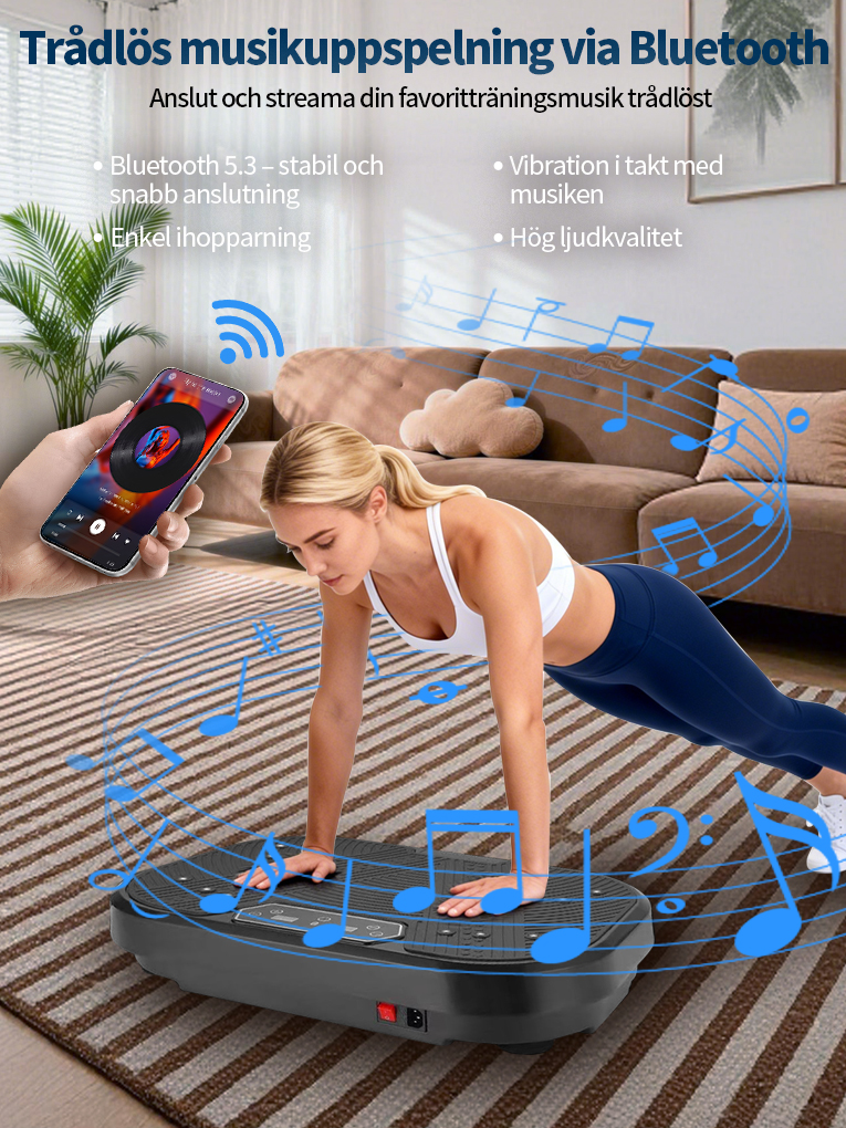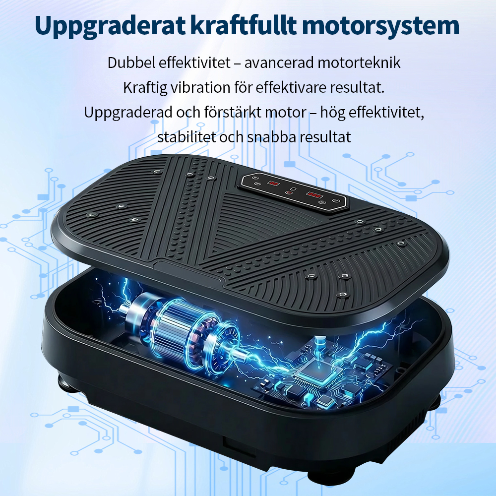 Utrustad med en uppgraderad högpresterande motor och vår avancerade "Dubbel Verkan-teknologi" garanterar vi inte bara kraftfulla och stabila vibrationer, utan även en effektiv energiöverföring till hela kroppen. Detta gör varje träningspass mer effektivt. Oavsett om du vill aktivera musklerna eller förbättra träningsresultaten, kommer du snabbt att märka en betydande skillnad.